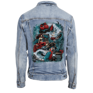 The ship looms larger and more mysterious, sails cutting through darkness. The compass rose and anchor feel symbolic rather than literal, floating like guiding forces. Emotionally, black denim transforms Pirate Cove into a nocturnal legend — dangerous, magical, and intimate — as if the wearer carries the sea and its secrets close, hidden in shadow and light.
