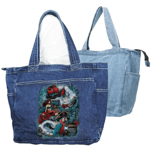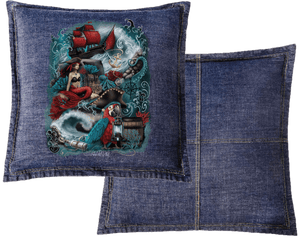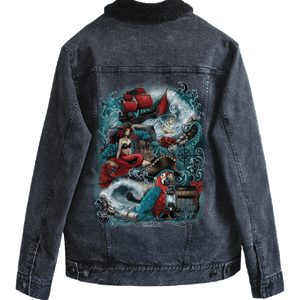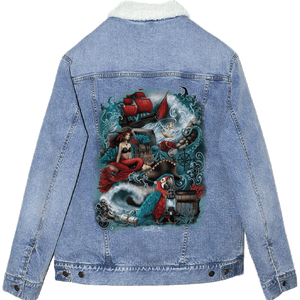 On stonewashed denim, the entire scene softens into legend. The red sails deepen into richer burgundy tones, and the mermaid’s tail loses some sharp contrast, becoming more velvety. Foam and mist blend beautifully into the worn twill, making the sea feel older and more storied.