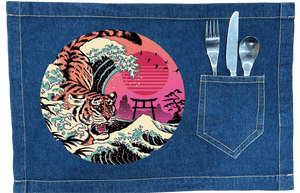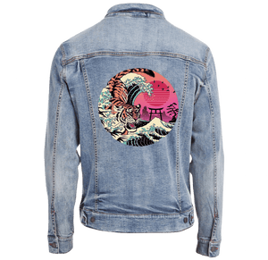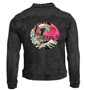 The torii gate and birds float like symbols rather than scenery. Emotionally, black denim transforms Rad Tiger Waveinto a nocturnal emblem of raw force and control—contained within a perfect circle, where animal, ocean, and iconography collide in a single, suspended surge of power.