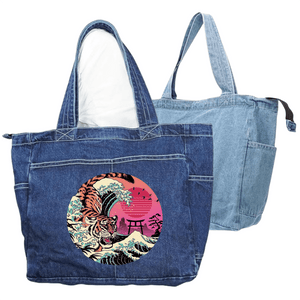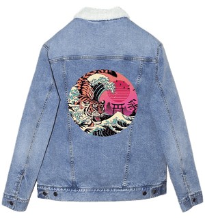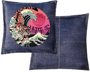 On stonewashed denim, the tiger’s stripes soften into warmer, earthier tones. The orange deepens and blends into the worn twill, and the black striping loses some sharpness, feeling more organic. The waves diffuse, their foam edges rounding as pigment sinks into the fabric grain. The pink sky fades toward duskier rose tones, and the red sun becomes muted and nostalgic.