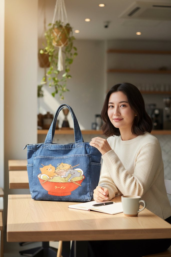 denim turns the artwork into something cozy and lived-in. The scene feels like