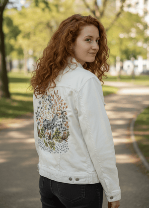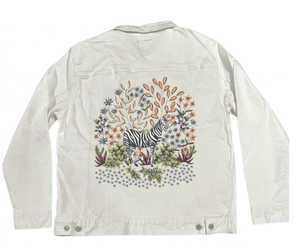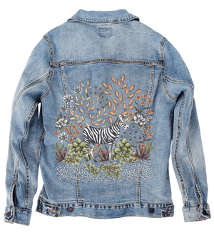 SAFARI ZEBRA by CECILIA BATTAINI, digitally printed on a hand-made Denim Jacket with 3 color choices: Stonewash, White, or Black. Unisex XS S M L XL 2X 3X