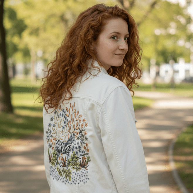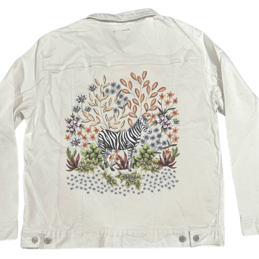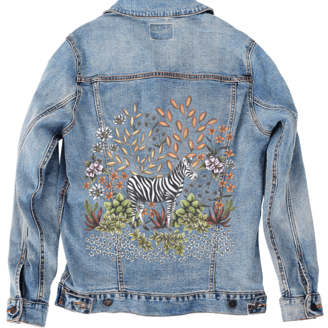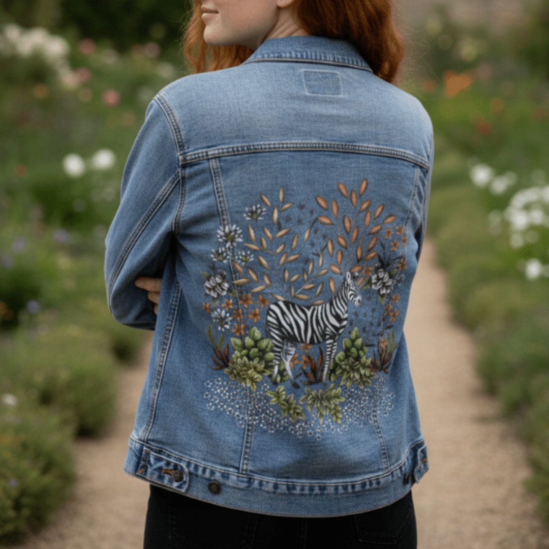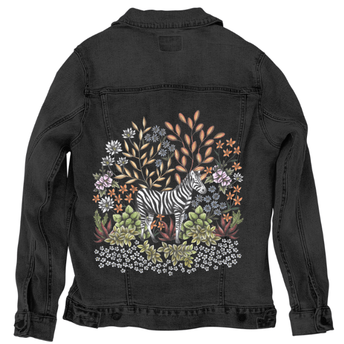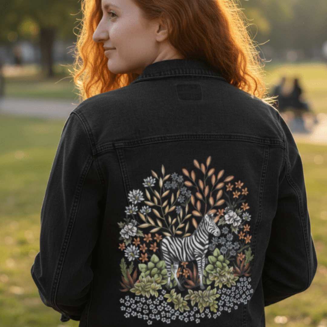 On stonewashed denim, the artwork takes on a softer, more organic presence. The zebra’s stripes blend gently with the fabric’s texture, creating a natural, lived-in feel. Botanical colors deepen slightly, enhancing the warmth of rust, gold, and green elements while maintaining the artwork’s calm, balanced mood.