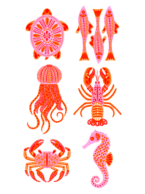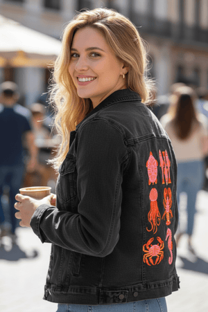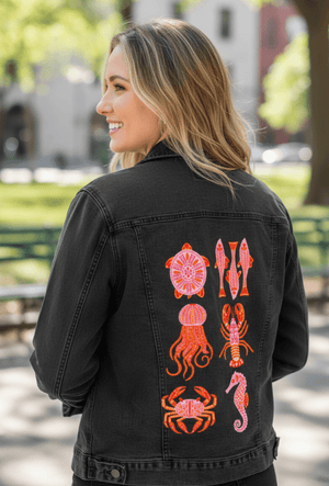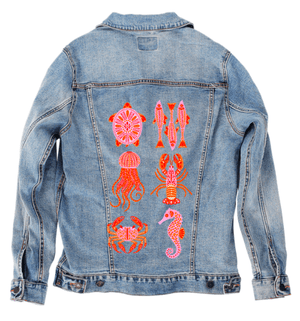 SEA ANIMALS by INDYSIGN, digitally printed on a hand-made Denim Jacket with 3 color choices: Stonewash, White, or Black. Unisex XS S M L XL 2X 3X