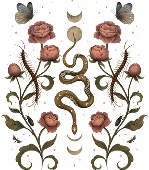 SERPENTINE GARDEN by EPISODIC DRAWING, digitally printed on a hand-made Denim Jacket with 3 color choices: Stonewash, White, or Black. Unisex XS S M L XL 2X 3X