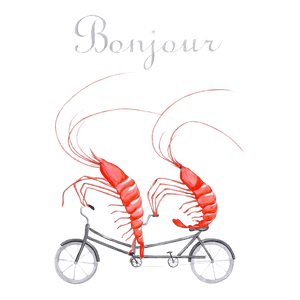 bright pink shrimp riding together on a gray tandem bicycle, their long curved