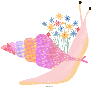 A large pastel snail moving toward the right, with a long pale peach body and two extended eyestalks tipped in dark circles. The snail carries an oversized spiral shell composed of layered bands in pink, lavender, yellow, and peach, decorated with dotted textures and fine curved lines. from the top of the shell rises a bouquet of small star-shaped flowers in blue, yellow, and coral on thin green stems. The background is transparent with no visible ground or color field. This artwork is titled “Snail Mail” and created by thearticsoul