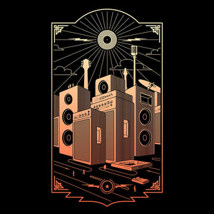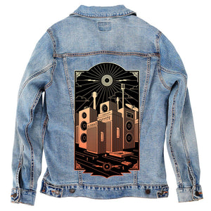 SOUND CITY by Grant Shepley, digitally printed on a hand-made Denim Jacket with 3 color choices: Stonewash, White, or Black. Unisex XS S M L XL 2X 3X