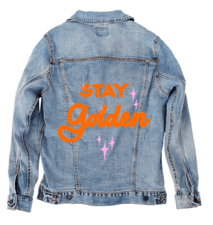 STAY GOLDEN by INDYSIGN, digitally printed on a hand-made Denim Jacket with 3 color choices: Stonewash, White, or Black. Unisex XS S M L XL 2X 3X