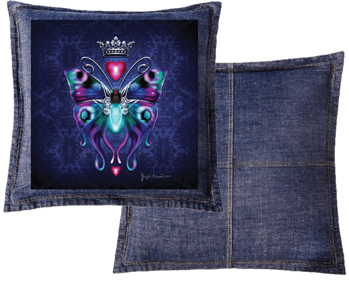 with elegant swirling antennae. above the butterfly floats a silver crown and a