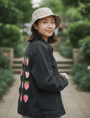 STRAWBERRY DREAMS by THEARTICSOUL, digitally printed on a hand-made Denim Jacket with 3 color choices: Stonewash, White, or Black. Unisex XS S M L XL 2X 3X