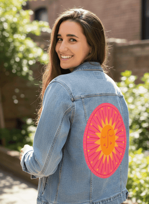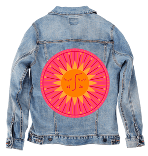 SUNBURST by HEND SHEHATA, digitally printed on a hand-made Denim Jacket with 3 color choices: Stonewash, White, or Black. Unisex XS S M L XL 2X 3X