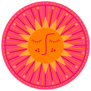 At the heart of the piece sits the sun. Its face is a smooth orange disk, calm and self-contained. The eyes are closed, marked by short curved lashes that arc gently downward, evenly spaced and symmetrical. A single continuous line forms the nose, running vertically and curving slightly as it descends, giving the face quiet character without expression. Two small pink dots rest on each cheek, placed deliberately and evenly, adding warmth without texture.