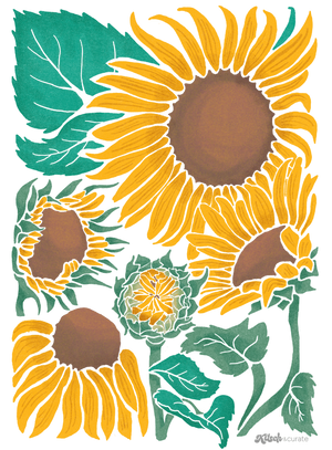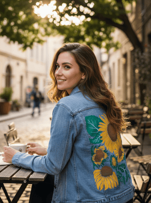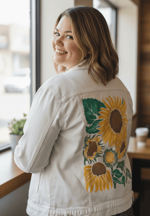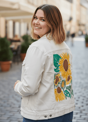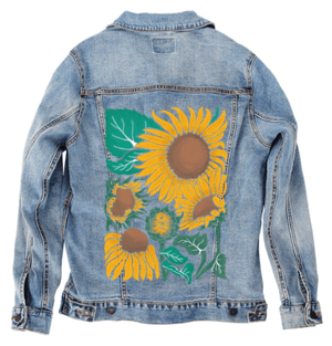 SUNFLOWER by KITSCH AND CURATE, digitally printed on a hand-made Denim Jacket with 3 color choices: Stonewash, White, or Black. Unisex XS S M L XL 2X 3X