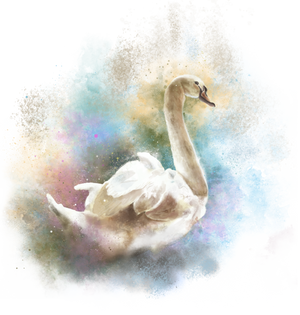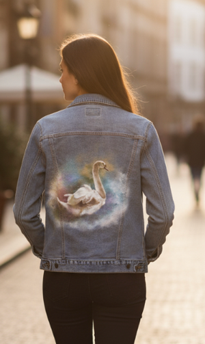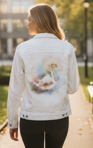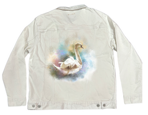 SWAN WATERCOLOR by RAMIR DESIGNS, digitally printed on DENIM products: throw pillows, aprons, table place mats, hand-made Unisex Denim Jackets in 3 color choices