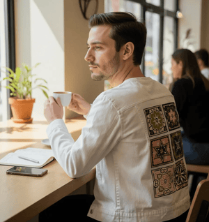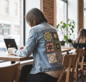 TALAVERA MEXICAN TILE by Catcoq, digitally printed on a hand-made Denim Jacket with 3 color choices: Stonewash, White, or Black. Unisex XS S M L XL 2X 3X