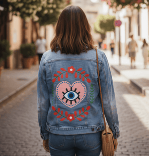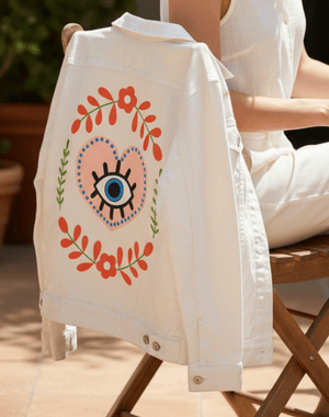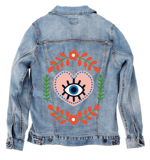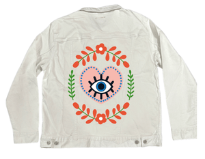 THE HEART SEES by HEND SHEHATA, digitally printed on a hand-made Denim Jacket with 3 color choices: Stonewash, White, or Black. Unisex XS S M L XL 2X 3X