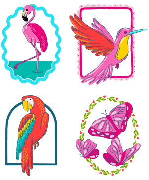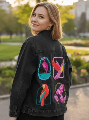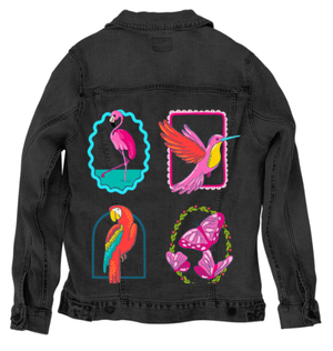 TROPICAL PARADISE by INDYSIGN, digitally printed on a hand-made Denim Jacket with 3 color choices: Stonewash, White, or Black. Unisex XS S M L XL 2X 3X