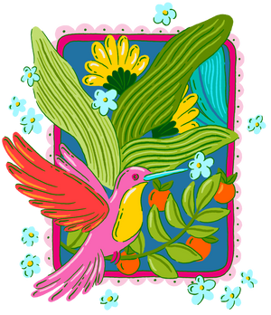 The illustration is static, with motion implied only through the hummingbird’s wing position and flowing leaf shapes. Energy comes from the sweeping curves of wings and foliage rather than actual movement.