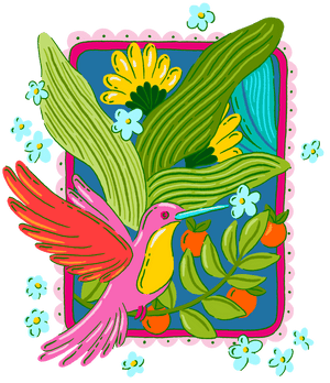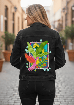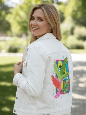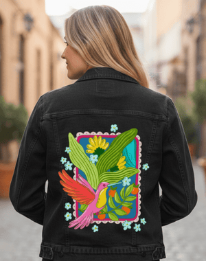 TROPICAL PARADISE HUMMINGBIRD by INDYSIGN, digitally printed on a hand-made Denim Jacket with 3 color choices: Stonewash, White, or Black. Unisex XS S M L XL 2X 3X