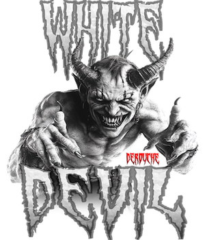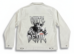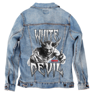 WHITE DEVIL by DeROUCHE DESIGNS by RAMIR DESIGNS, digitally printed on a hand-made Denim Jacket with 3 color choices: Stonewash, White, or Black. Unisex XS S M L XL 2X 3X