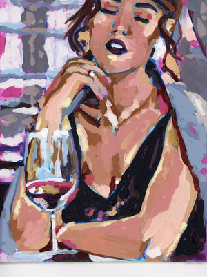 WINE GIRL by PAIGE FLOTTERUD, digitally printed on a hand-made Denim Jacket with 3 color choices: Stonewash, White, or Black. Unisex XS S M L XL 2X 3X