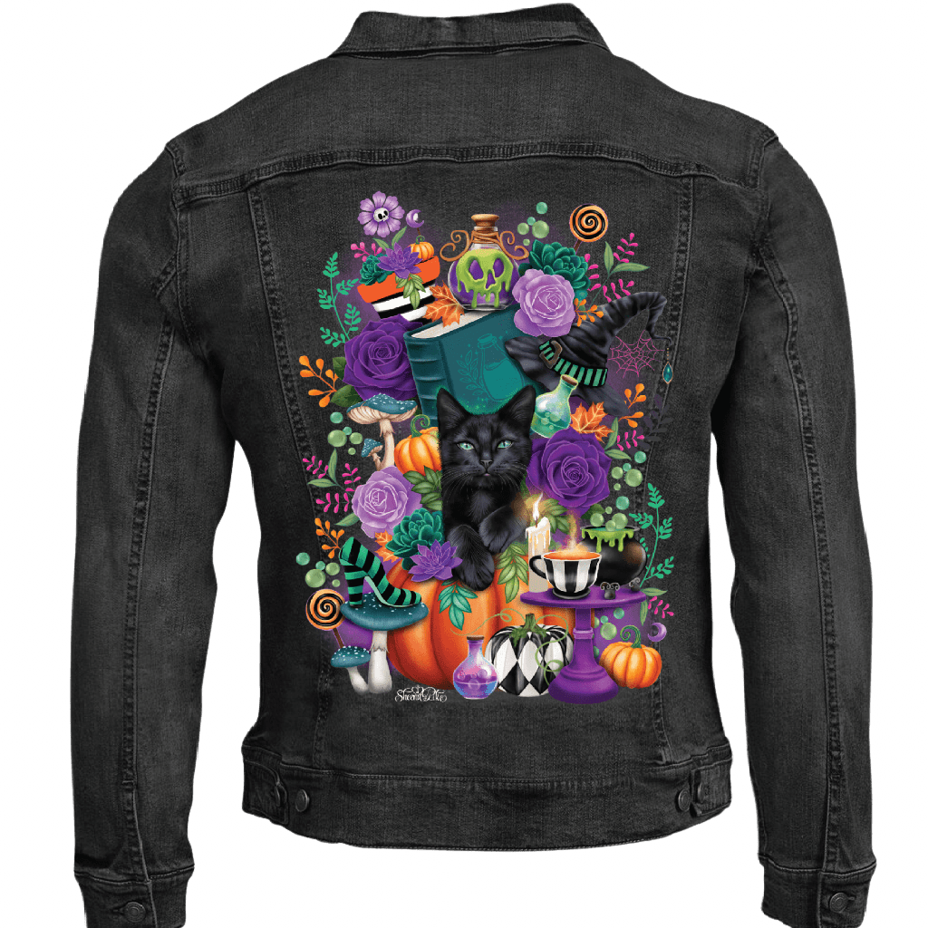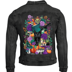 The candle flame, potion glows, and dripping green elements stand out dramatically. Background splatters recede, focusing attention on the cat as the true center. Emotionally, black denim transforms Witches Companion into a nocturnal familiar—quiet, observant, and powerful—held close in shadow and color, as if guarding the magic gathered around it.