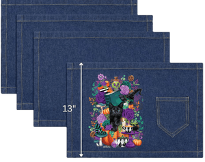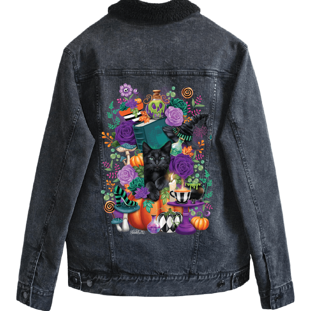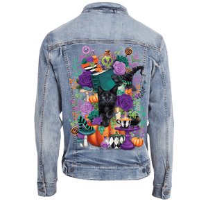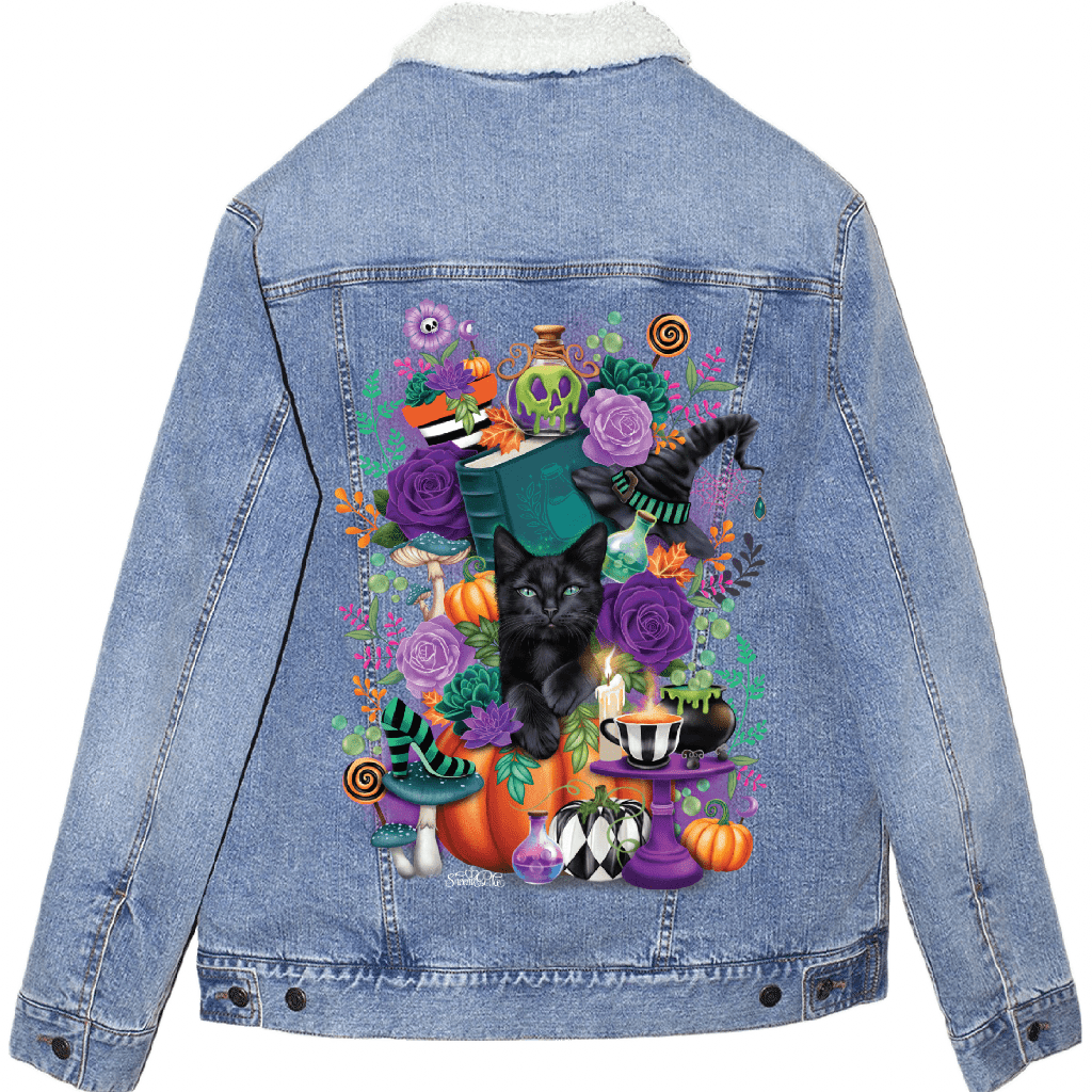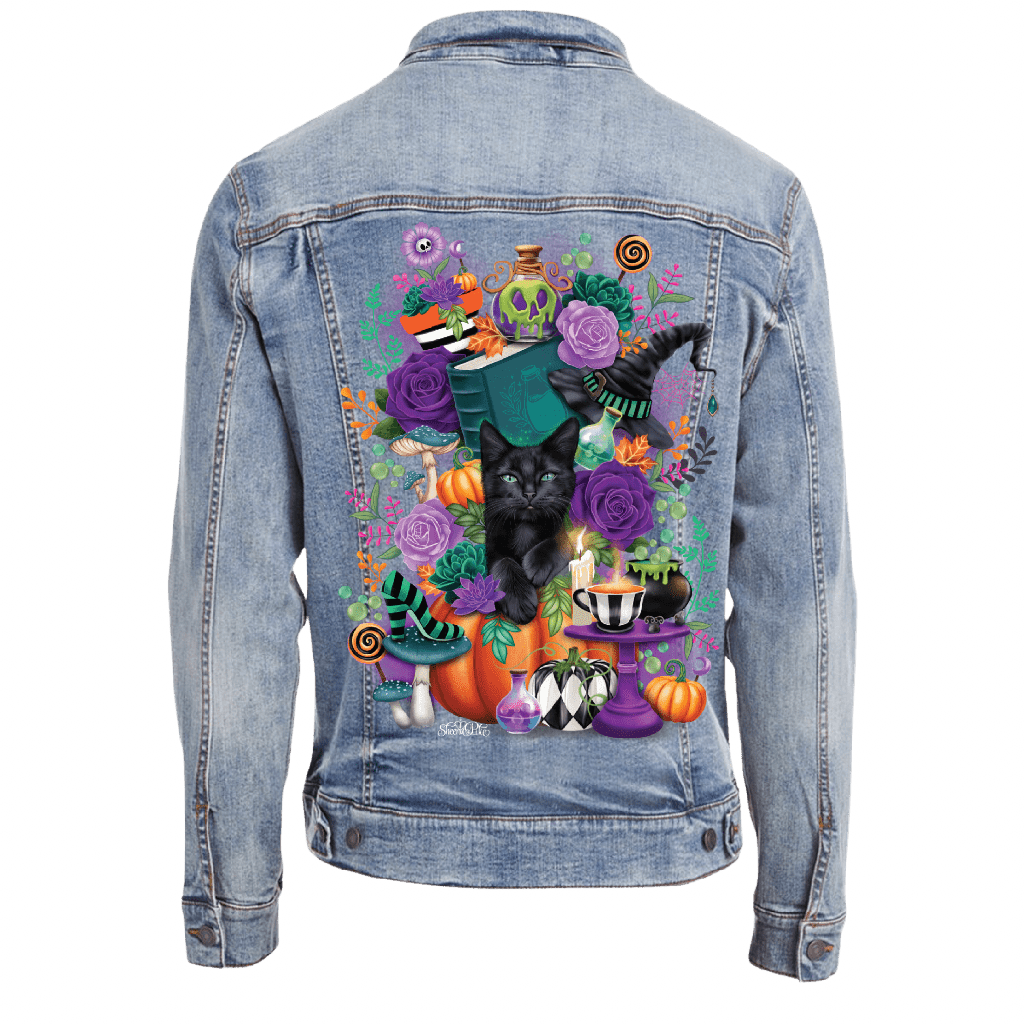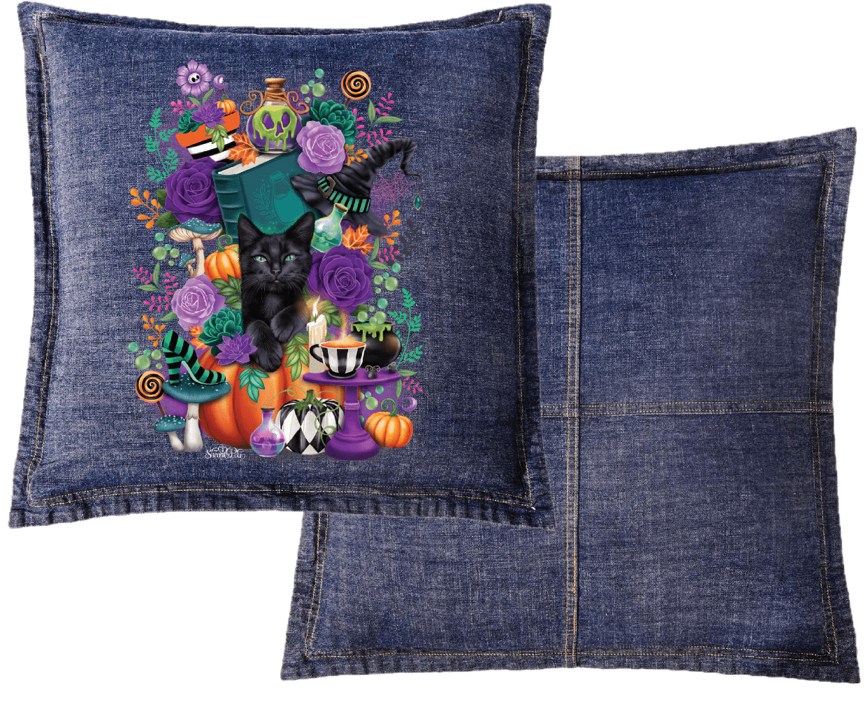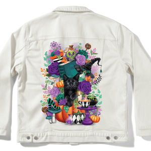 On stonewashed denim, the scene softens into cozy magic. The purple background diffuses into the worn twill, muting its saturation and giving it a velvety depth. The cat’s black fur blends gently into the fabric grain, softening highlights while preserving the green eyes as focal points. Orange pumpkins deepen into warmer, earthier tones.