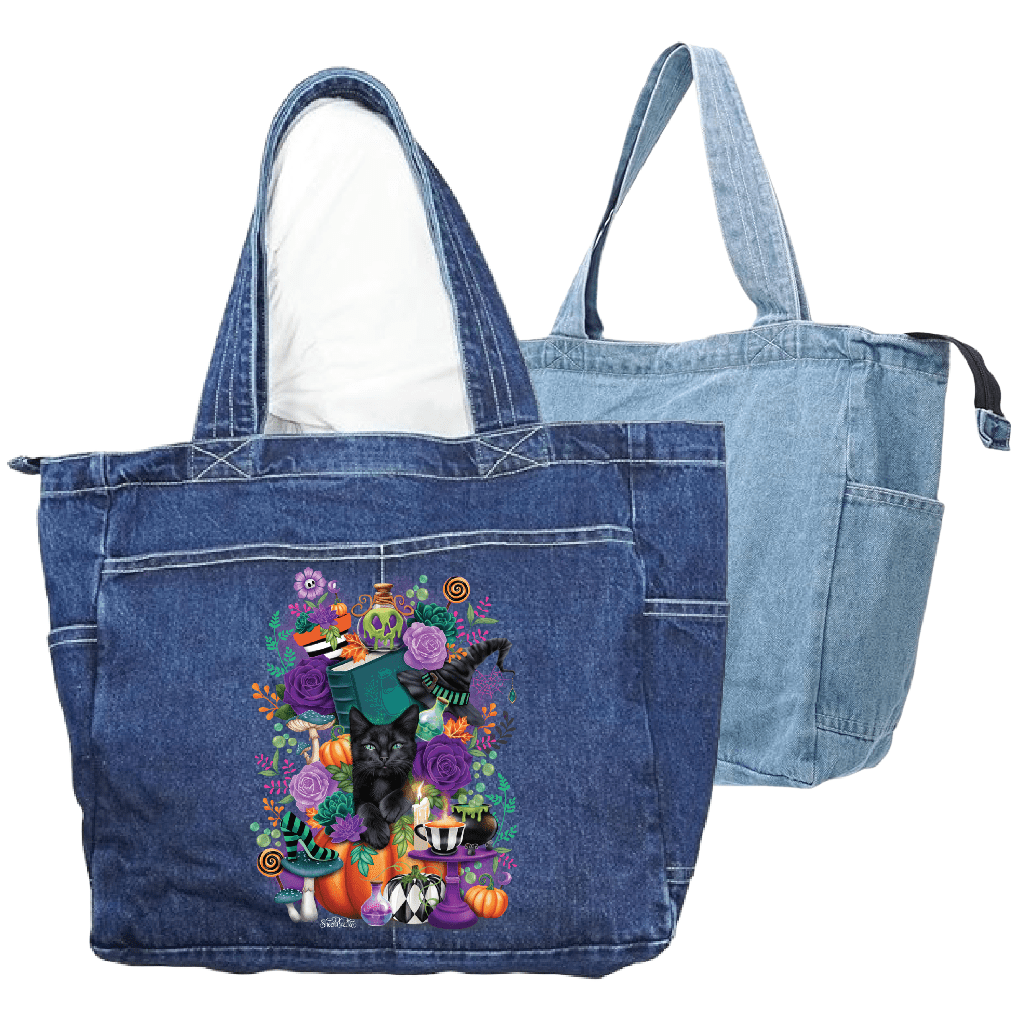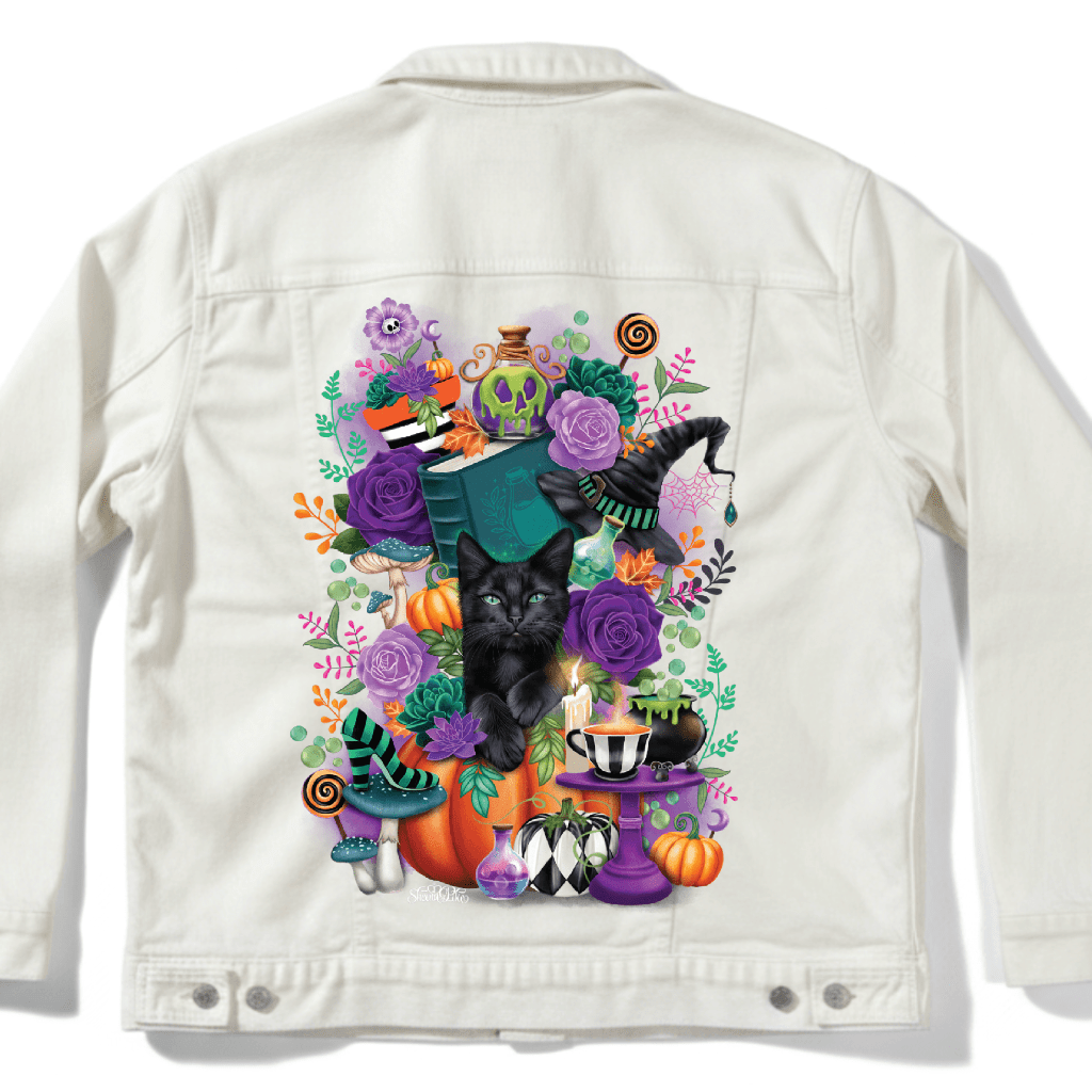 Potion bottles and glassware sparkle, their colors clean and distinct. The spell book symbol reads clearly, and the candle flame becomes a precise point of light. Emotionally, white denim presents the artwork as playful and illustrative—a bold, whimsical celebration of magic.