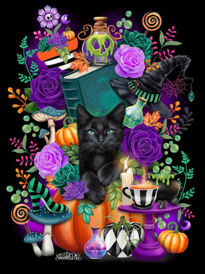 A black cat with bright green eyes sitting upright atop an orange pumpkin, paws crossed forward. the cat is surrounded by a dense witchy still life including purple roses, green leaves, mushrooms, pumpkins, striped candles, potion bottles with glowing liquid, a black cauldron, a teacup, a spell book, a skull-topped potion jar, candy swirls, spiderweb details, and a black witch hat with green stripes. The background is a vivid purple with splattered texture. this artwork is titled “Witches Companion” and created by Sheena Pike