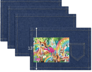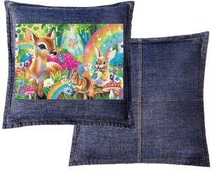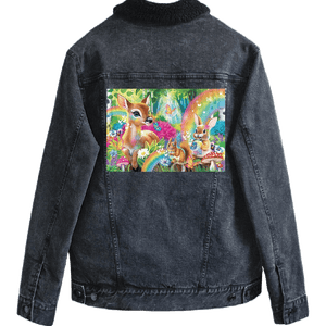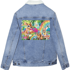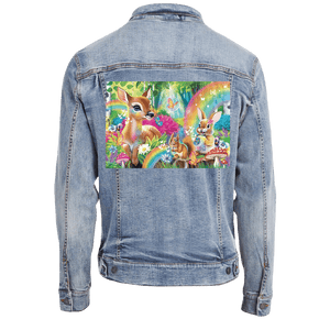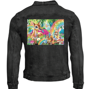 The rainbows and butterflies become more atmospheric than vibrant, blending into the denim’s natural texture. This gives the forest a slightly weathered, storybook quality — like a well-loved illustration passed down over time. On stonewashed denim, Woodland Friends Rainbow Magic feels comforting and familiar, emphasizing gentleness and emotional warmth.