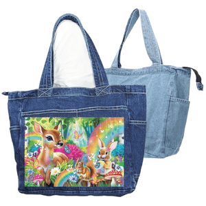 The fawn’s face feels especially serene and luminous, as if emerging from the forest itself. The jars of butterflies read like captured starlight, and the surrounding foliage frames the scene with depth and mystery. On black denim, Woodland Friends Rainbow Magic feels magical and immersive — a forest that exists just beyond ordinary reality.