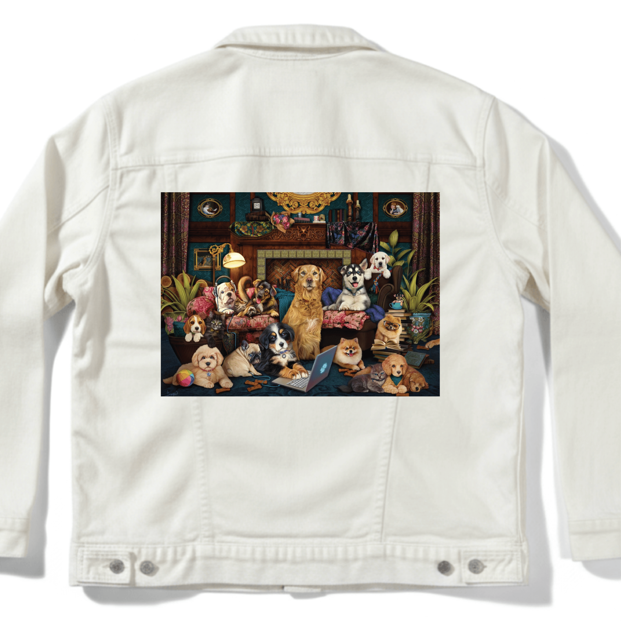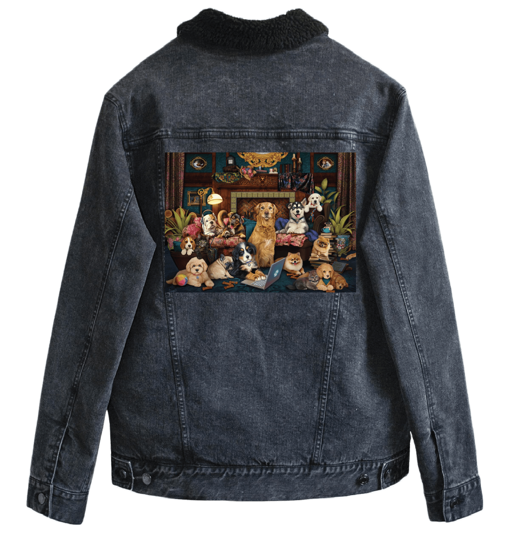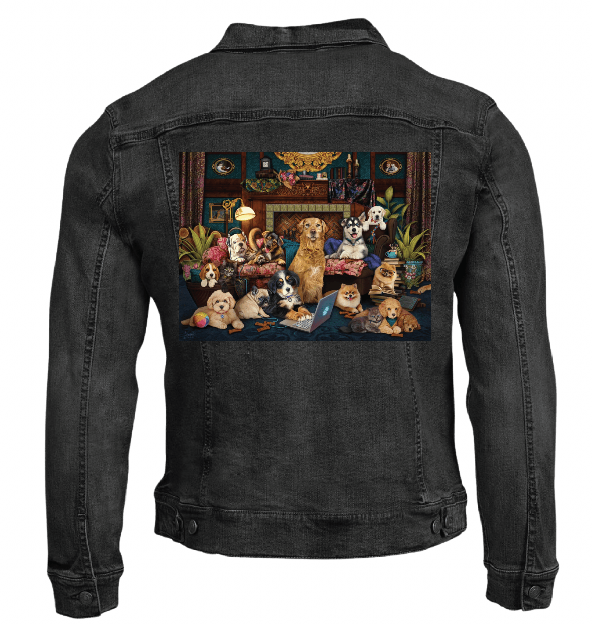 work-from-home humor and sense of togetherness. On black denim, the artwork