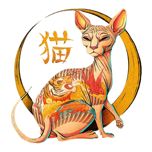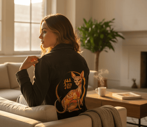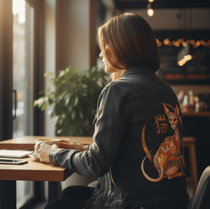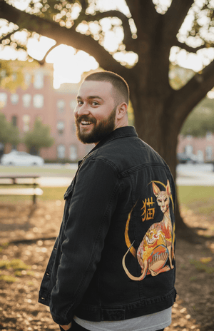 YAKUZA CAT by Tobe Fonseca,digitally printed on a hand-made Denim Jacket with 3 color choices: Stonewash, White, or Black. Unisex XS S M L XL 2X 3X