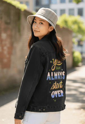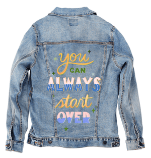 YOU CAN ALWAYS START OVER by THEARTICSOUL, digitally printed on a hand-made Denim Jacket with 3 color choices: Stonewash, White, or Black. Unisex XS S M L XL 2X 3X